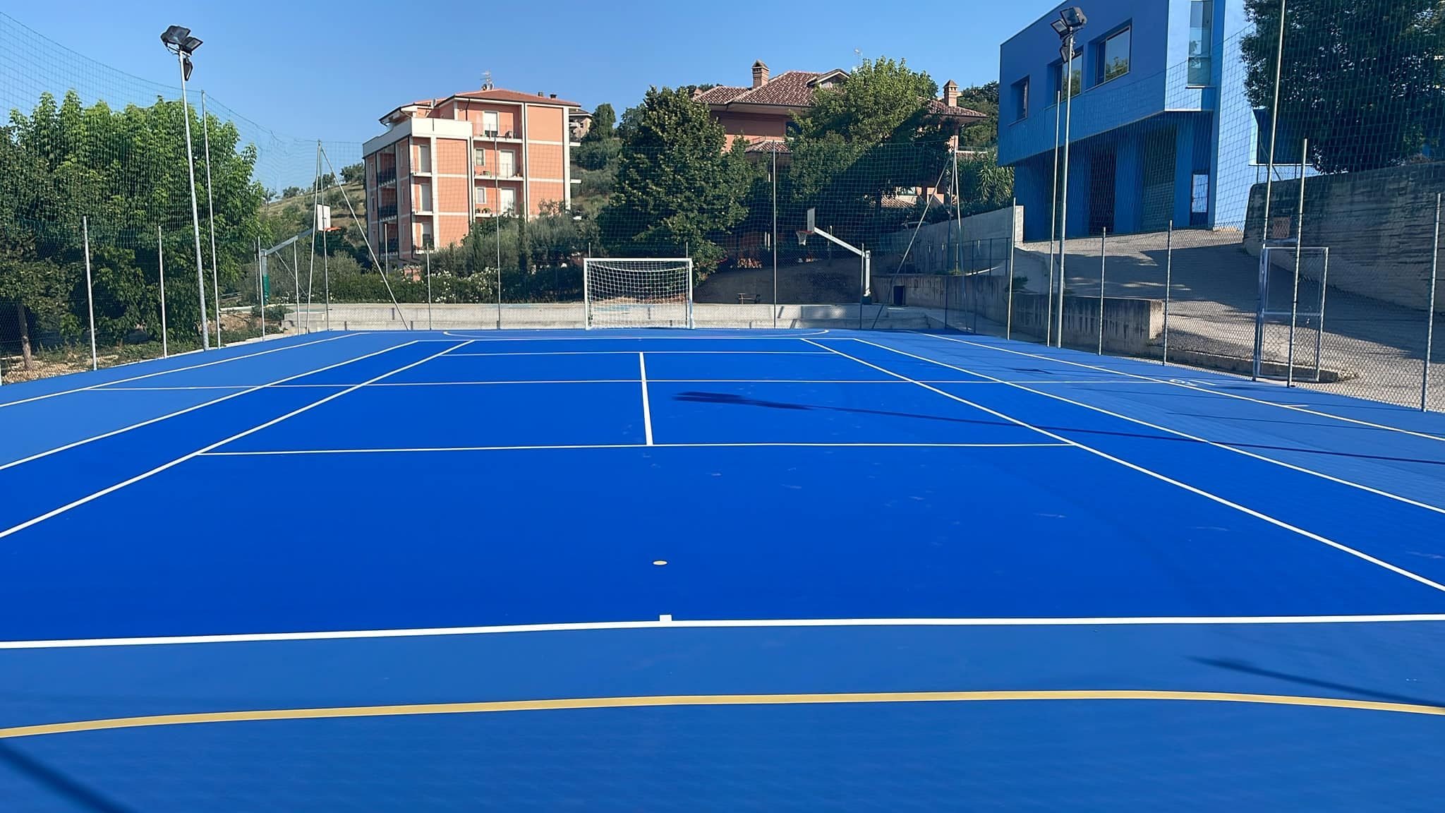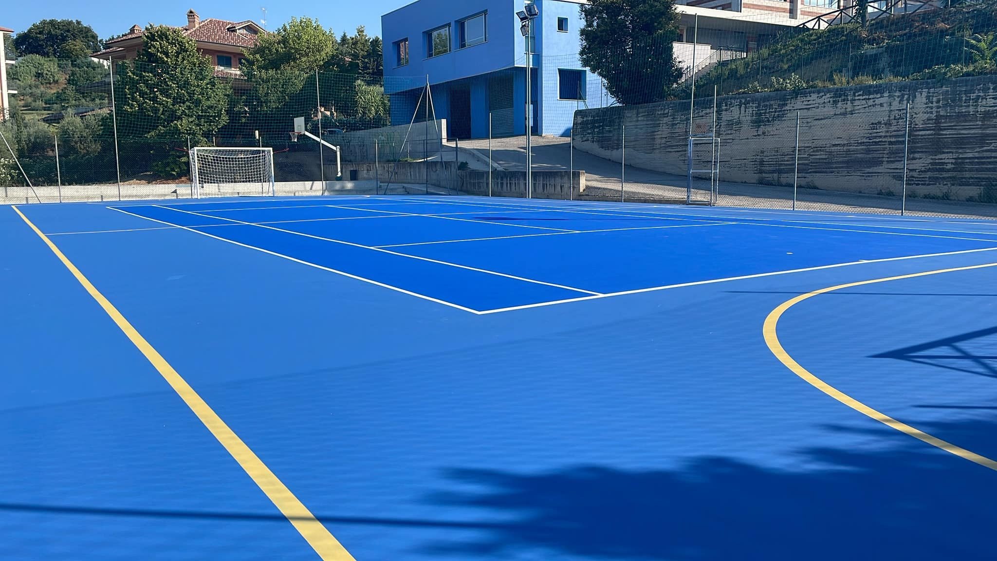 Il campo in resina sintetica è adatto sia per l’uso interno che per quello esterno ed è strutturato nel seguente modo: pavimentazione sintetica impermeabile (con colori a scelta del cliente) distesa in più strati su sottofondo in tappetino bituminoso, è composto da resine acriliche e inerti quarziferi e non necessita di una manutenzione giornaliera. Questa superficie è stata studiata per fornire lunga durata, un buon comfort e una alta qualità di gioco. Un grande valore aggiunto di questa tipologia di campo è la polivalenza: infatti si può predisporre la superficie di gioco anche per atri sport quali pallavolo, basket e calcetto oltre alle piste ciclabili e piste di pattinaggio